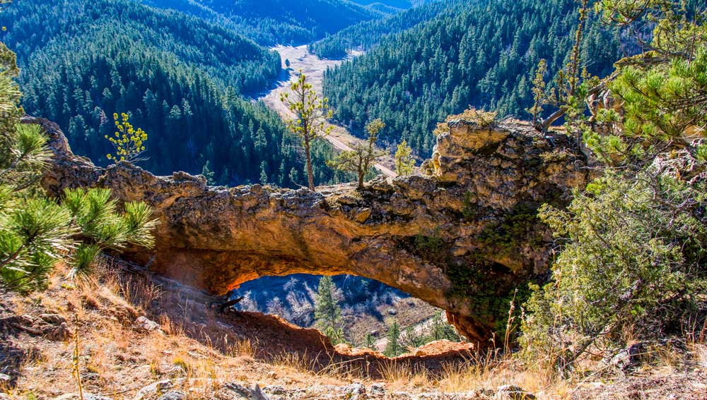 The property is bisected by the Grand Canyon of the Black Hills, a picturesque landscape with limestone cliffs, caves, ledges and a natural bridge. It lies in the western Black Hills near the Wyoming-South Dakota border and features nearly 17 miles of streams as well as springs, marshes, wetlands and riparian habitat. It also provides vital winter range for elk, whitetail and mule deer, and habitat for bighorn sheep, wild turkey and a wide variety of birds and animal life.